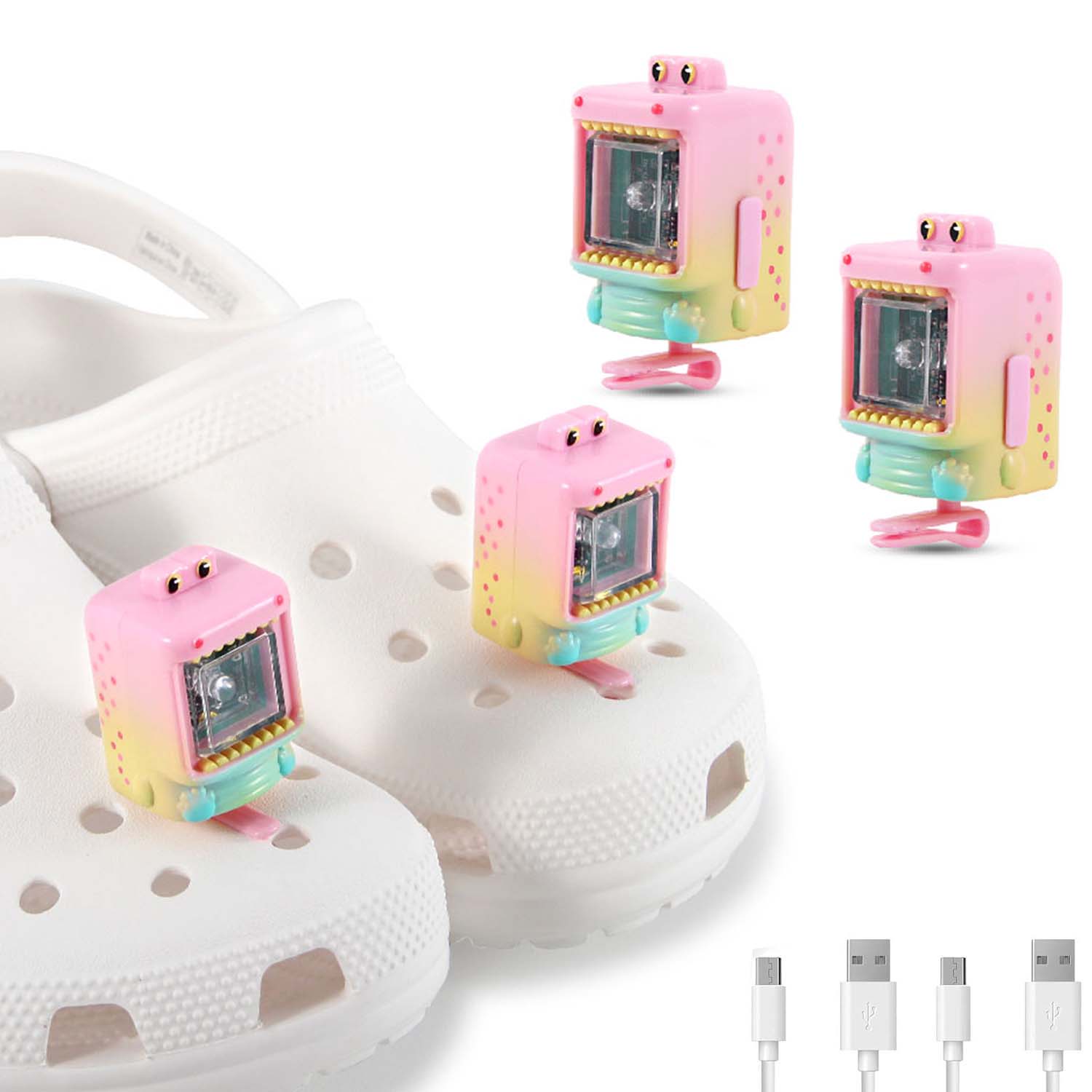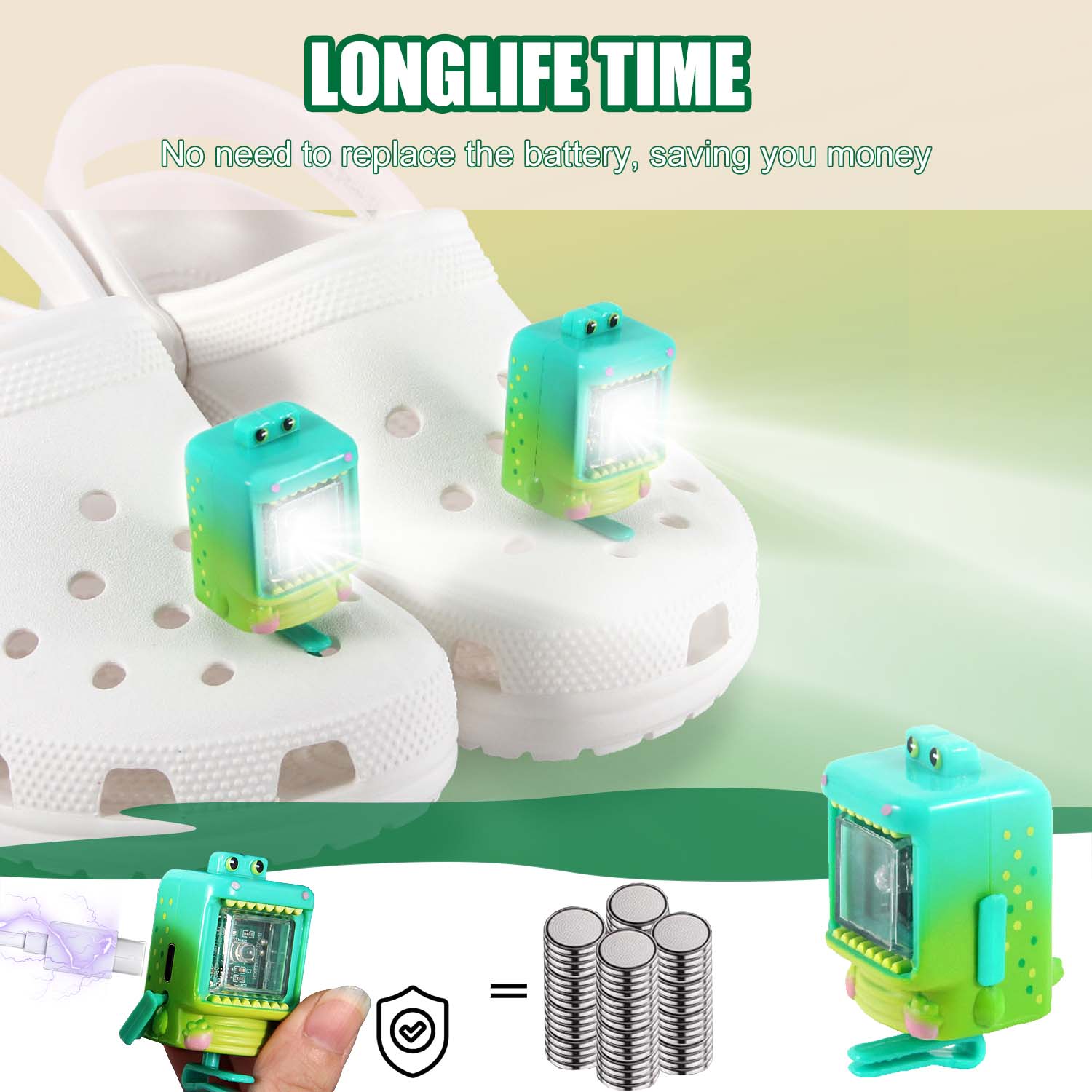 Ultra-Bright and Long-Lasting: Our croc lights feature a captivating dinosaur design that not only adds a fun touch but also provides hands-free illumination for nighttime activities like dog walks, strolls, and camping adventures. With a full charge, our croc lights can shine for an impressive 72 hours, making them a must-have for night owls, hikers, and campers in your friends and family.