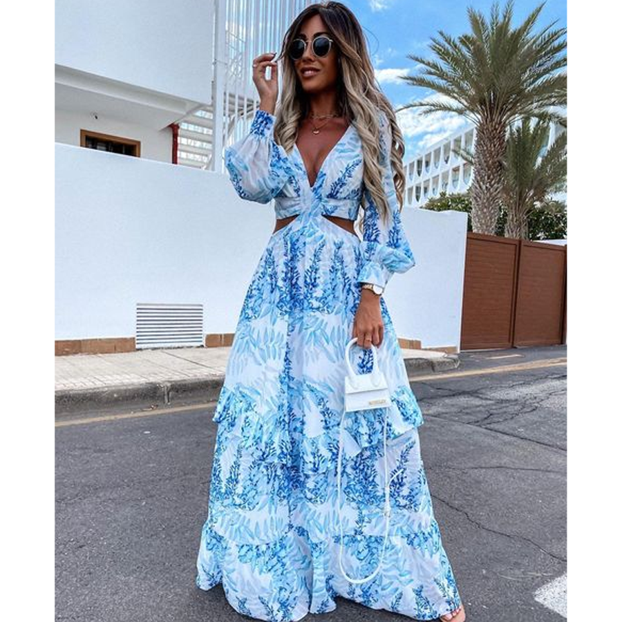 Long Sleeve Cutout Floral Beach Casual Dress