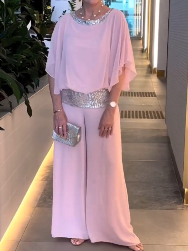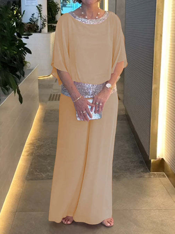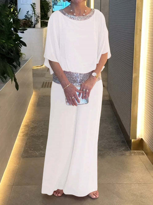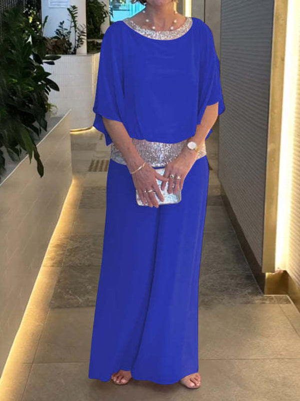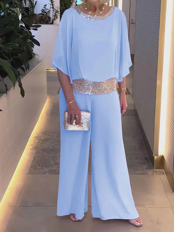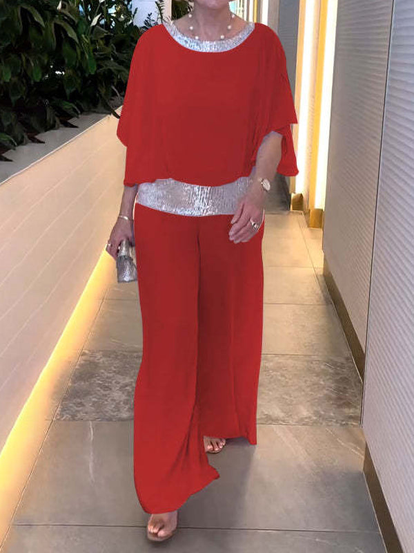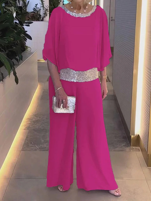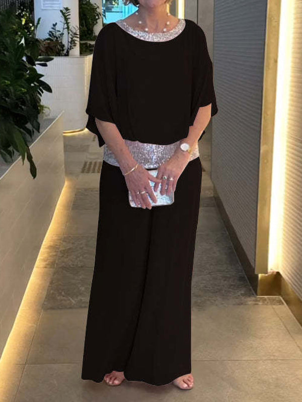 New Round Neck Sequined Color Matching Ladies Two-Piece Suit