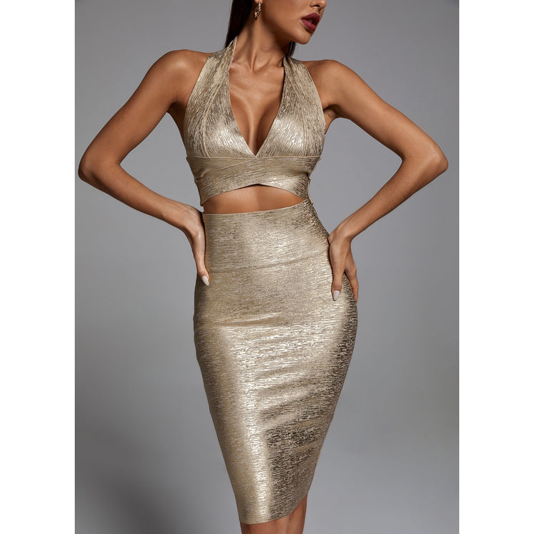 V Neck Halter Gold Bandage Two Piece Skirt Set