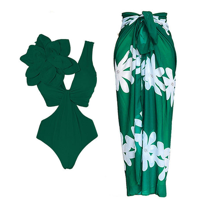 3D Flower Cut out One Piece Swimsuit and Sarong