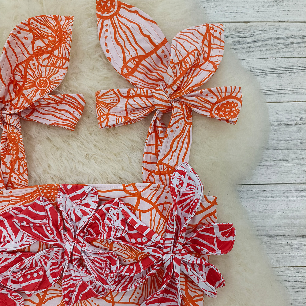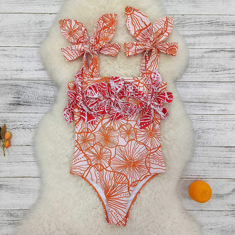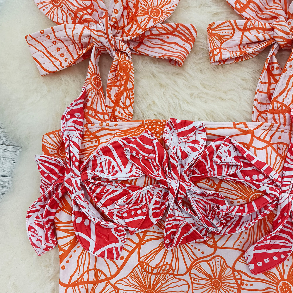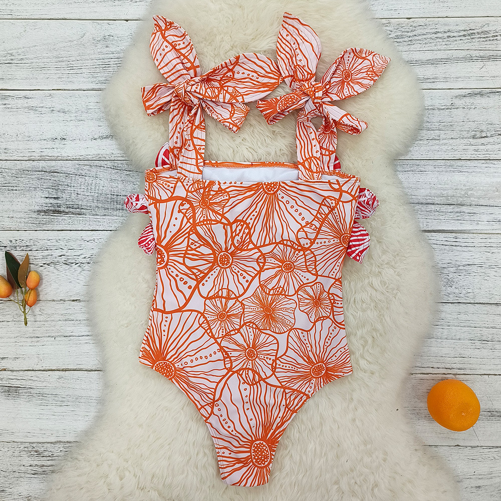 3D Flower Color Block Bowknot Printed One Piece Swimsuit