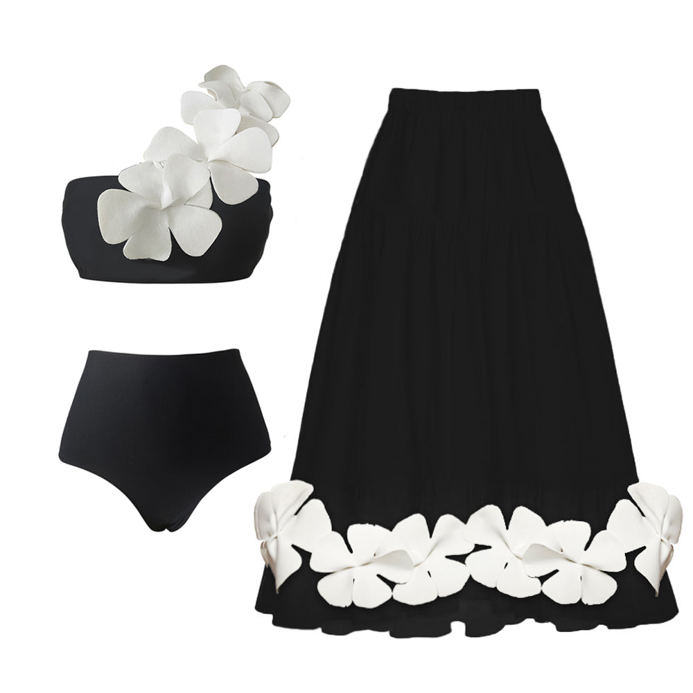 One Shoulder 3D Flower Black Bikini Swimsuit and Skirt
