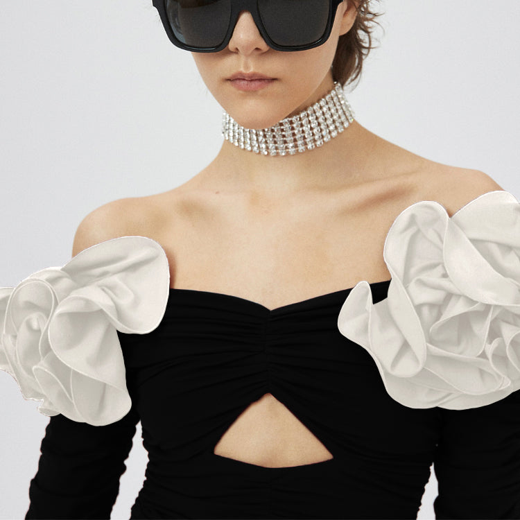 Vioye Black Off Shoulder 3D Flower Long Sleeve One Piece Swimsuit and Skirt