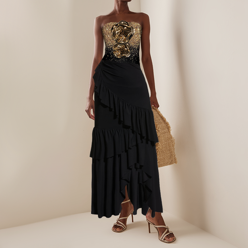3D Flower Shiny Printed One Shoulder One Piece Swimsuit and Skirt